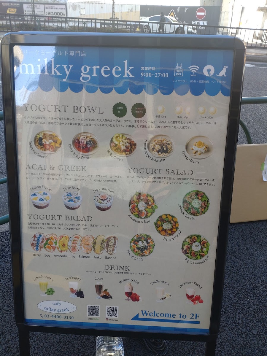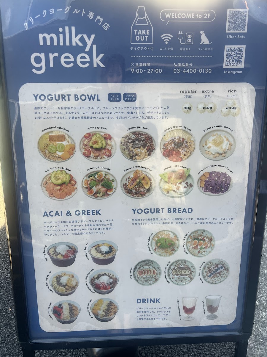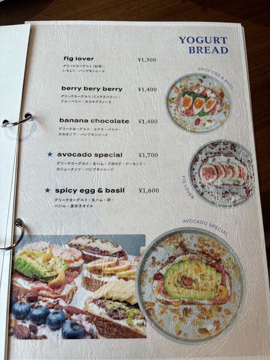 The menu at cafe milkygreek麻布十番shisha offers a range of Greek yogurt-based bowls alongside beverages suitable for breakfast, light meals, or casual coffee breaks. The food selections are centered on various yogurt bowls featuring seasonal fruits such as Shine Muscat and fig, as well as options including avocado, banana chocolate, berry varieties, spicy egg with basil, and original blends. Prices for these bowls range from approximately JP¥1,400 to JP¥2,100.